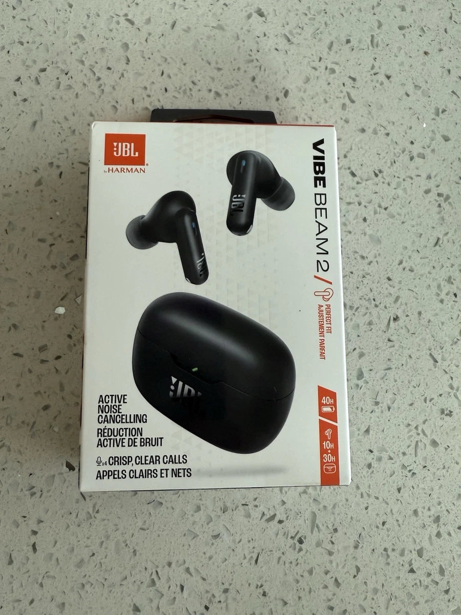The JBL Vibe Beam 2 earbuds offer Active Noise Cancelling, JBL Pure Bass Sound, and Smart Ambient modes, providing up to 40 hours of playback with fast charging, plus they are IP54 water/dust resistant and feature four mics for clear calls, multi-point Bluetooth, and customization via the JBL Headphones app. Key features include 8mm drivers, Google Fast Pair, and voice awareness.